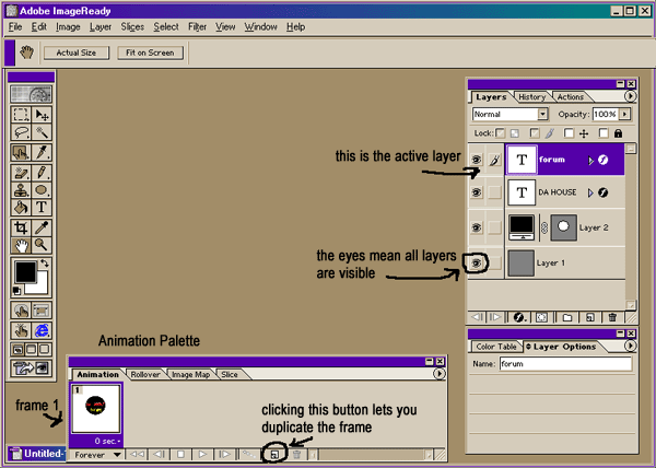 | Let's take another look at the ImageReady workspace. In this screen shot the animations palette shows the first frame and how to duplicate it. There are also references to the active layer and the visible layers. |